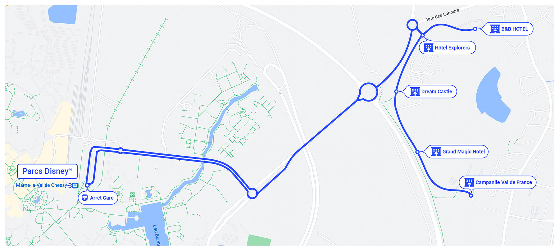 Nos 6 navettes transportent gratuitement les clients des hôtels du Val de France, entre les cinq hôtels du Val de France et la gare de Chessy (Parcs Disney®).